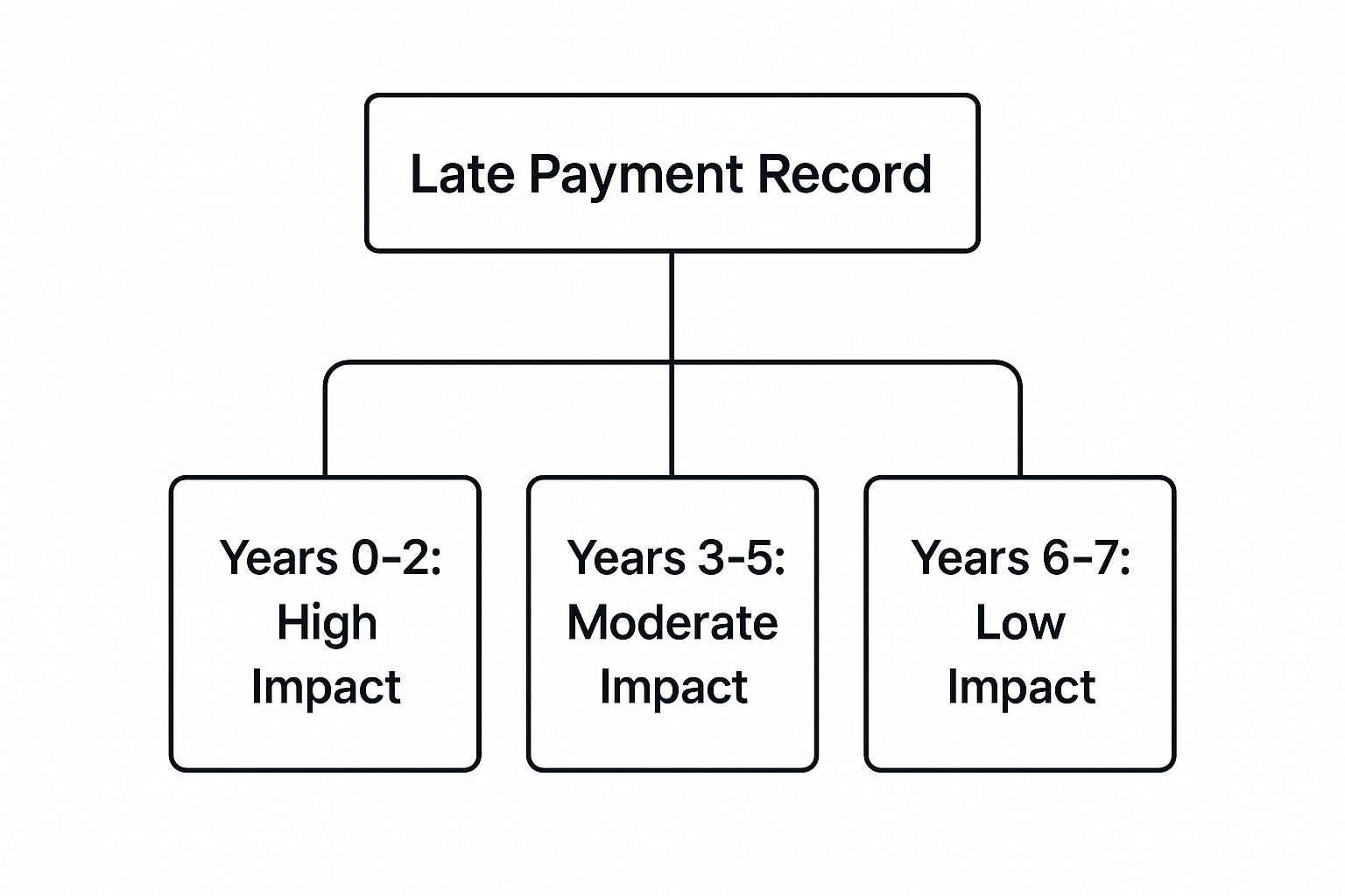 Think of a late payment like a blemish on your financial history. When it first appears, it's a fresh, glaring mark that can really drag down your credit score. But over time, that blemish starts to fade. Its influence on your score gradually lessens until, one day, it vanishes completely.